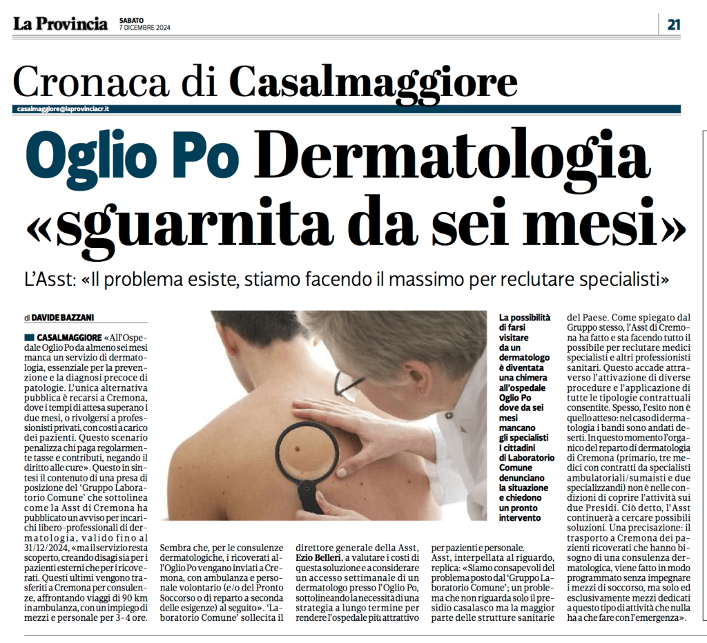 Siamo perfettamente consapevoli dello stato di crisi della sanità (locale, regionale e nazionale) e della difficoltà di trovare medici disponibili ad accettare un incarico. Diamo atto alla ASST di Cremona dell’impegno che sta profondendo per cercare di sanare la situazione, non ultima la pubblicazione in data 31/07/2024 di un avviso pubblico per il conferimento di incarichi libero professionali per lo svolgimento di attività specialistica di dermatologia, valido fino al 31/12/2024.