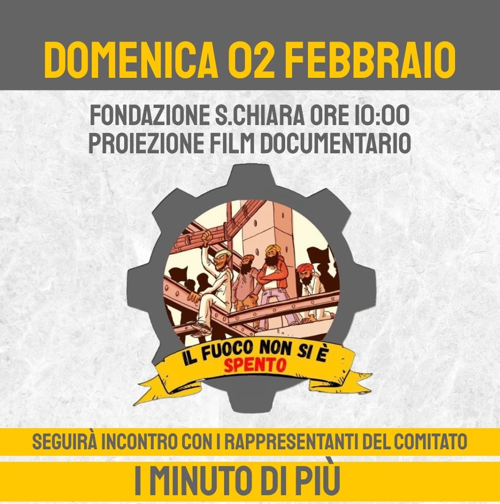 Domenica 2 febbraio alle ore 10:00, nella chiesetta di Fondazione Santa Chiara (via Formis 3 – Casalmaggiore CR), ci sarà la proiezione del film-documentario “Il fuoco non si è spento“. A seguire ci sarà un dibattito orizzontale sul documentario e i temi che affronta. Ci sarà poi il pranzo di solidarietà presso il centro Primavera (via Formis 14 – Casalmaggiore CR). Il ricavato andrà alla cassa comune del comitato di solidarietà “1 minuto di più“.