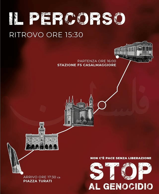 Domenica 16 marzo si svolgerà un corteo in sostegno del popolo palestinese organizzato dal Collettivo Onda Queer e dal Circolo Rive Gauche. Il concentramento sarà alle 15:30 nel piazzale della stazione ferroviaria di Casalmaggiore. Il corteo partirà alle 16:00 percorrendo viale Mazzini, via Cavour e piazza Garibaldi, per concludersi in piazza Turati (piazza Vecchia).