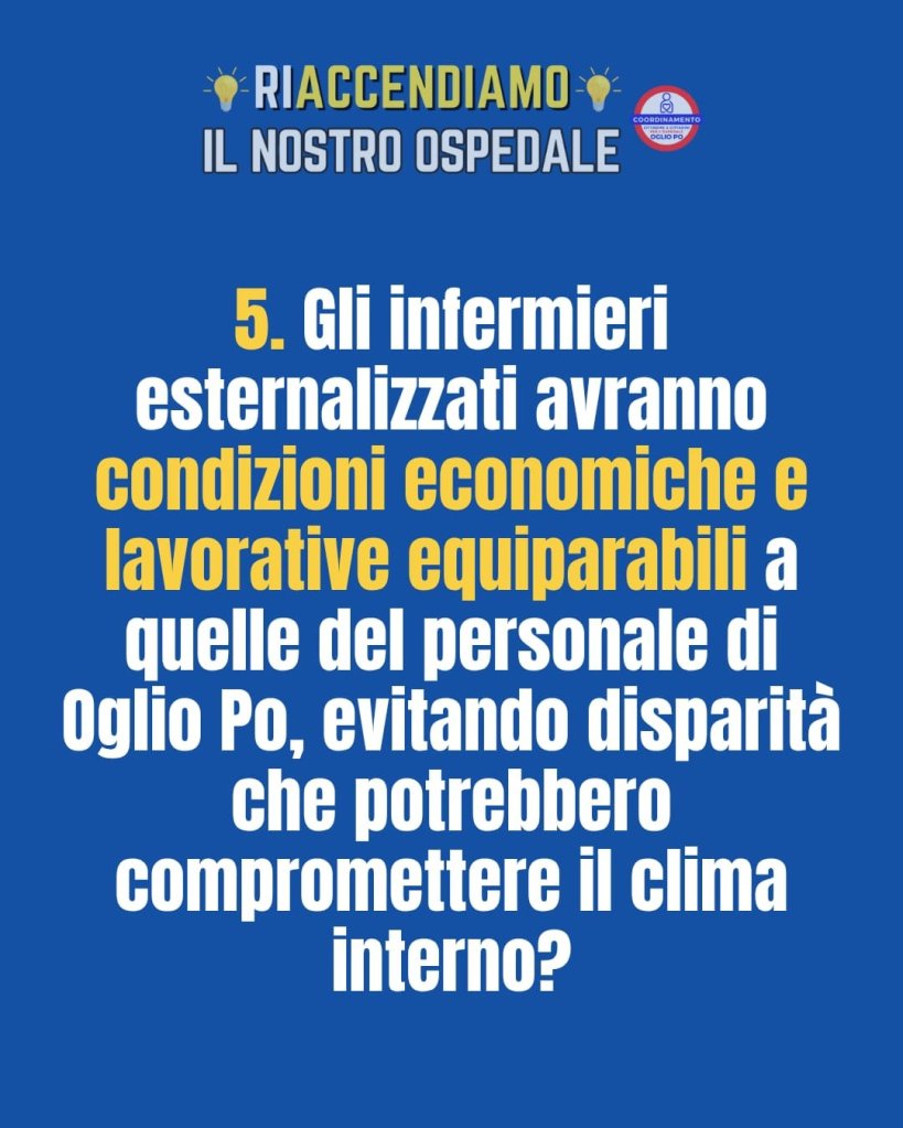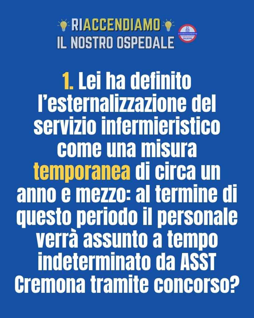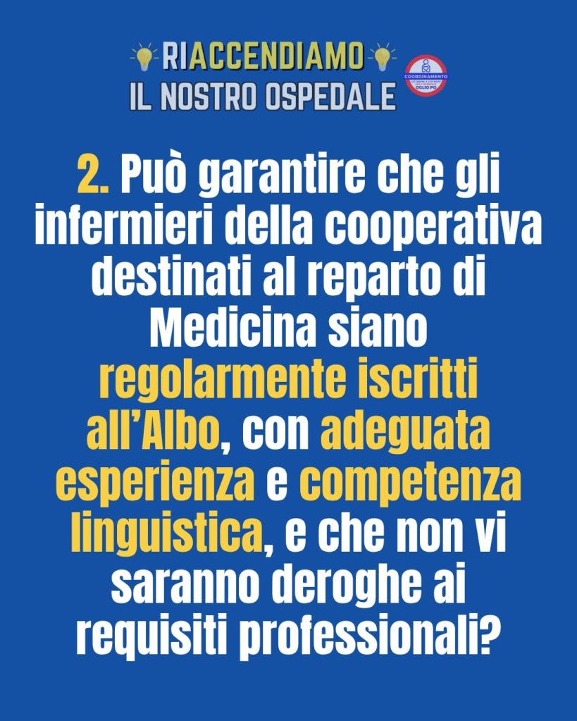Rivolgere domande ai responsabili della nostra sanità non è un gesto di contrapposizione, bensì un atto di trasparenza e responsabilità verso i cittadini. Il Coordinamento si aspetta risposte chiare e pubbliche sull’esternalizzazione degli infermieri in un confronto aperto e leale, perchè è in gioco la salute della Comunità.