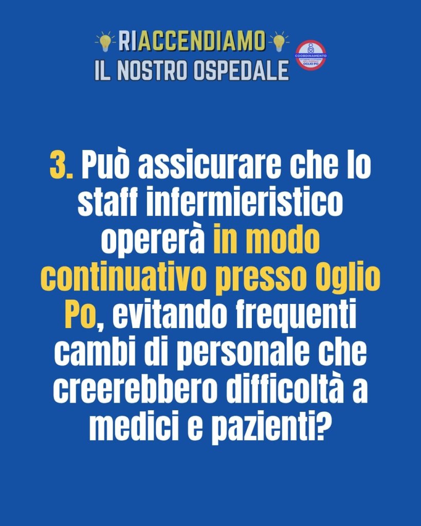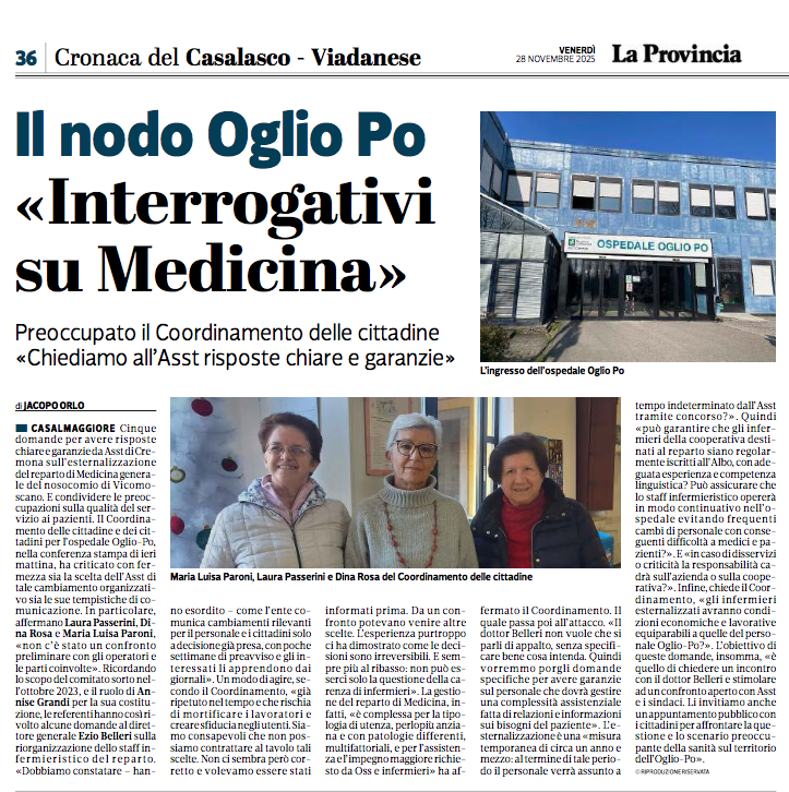 Mantenendo la promessa fatta ai cittadini, Il Coordinamento Cittadine e Cittadini per l’Ospedale Oglio Po, ha acceso i riflettori sulla riorganizzazione del personale di Medicina formulando 5 quesiti chiari e sintetici al Direttore Generale durante una conferenza stampa tenuta il 27 Novembre 2025 al Centro Primavera di Casalmaggiore.