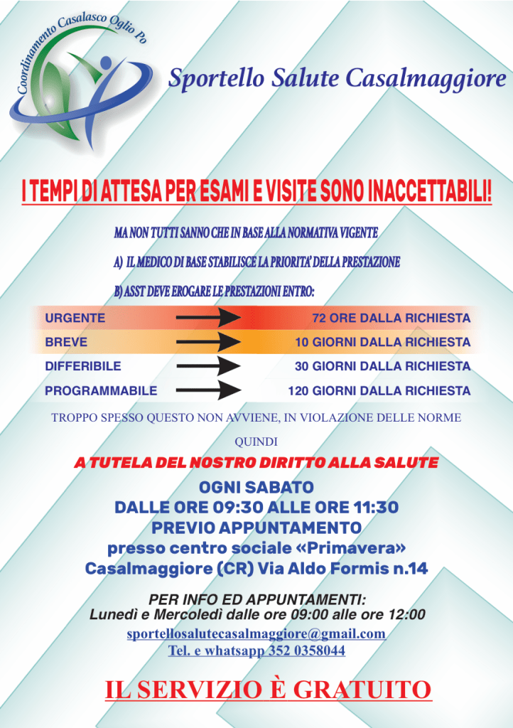 Nasce a Casalmaggiore lo Sportello Salute, un nuovo servizio di informazione e tutela rivolto ai cittadini che incontrano difficoltà nell’accesso alle prestazioni sanitarie, in particolare a causa delle lunghe liste di attesa per visite specialistiche ed esami diagnostici.